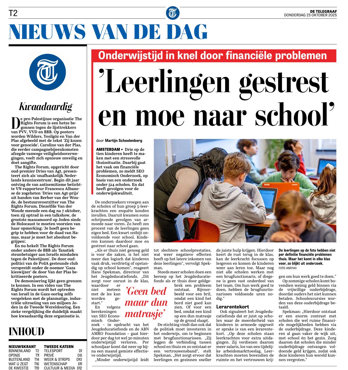 🔗 Telegraaf voorpagina: Geldzorgen thuis kosten kind lestijd en Leerlingen verliezen maand onderwijstijd door armoede: ‘Dit zorgt voor onrust in de klas’